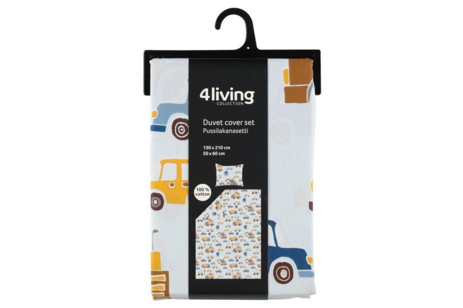 4living Biili pussilakanasetti ilahduttaa autojen, traktoreiden ja muidenkin menopelien ystäviä. Anna Säterin suunnittelemasta vaaleansinisestä taustasta erottuu keltaisen, sinisen ja ruskean sävyissä erilaisia ajoneuvoja, joita on mukava katsoa. Pussilakanoilla saa helposti tuotua väriä huoneeseen. Kooltaan pussilakanasetti on 150x210 cm, joten setti sopii isommillekin lapsille. Lasten Biili pussilakanasetti on myös loistava lahjaidea. Puuvillaiset pussilakanat ovat myös miellyttävän pehmeän tuntuiset, ja lakanoihin on ihana kääriytyä nukkumaan. Tilaa ihastuttava 4living Biili pussilakanasetti 150x210 cm edulliseen hintaan ja nopealla toimituksella verkkokaupastamme! Pussilakanasetti on ostettavissa myös myymälästämme.
