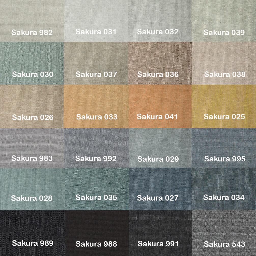 - Sakura-kangas: 51 % polyesteri, 34 % polyakryyli, 15 % puuvilla, kulutuksen kesto 50 000 Martindale, Pilling-arvo 4-5, kangas on likaa ja vettä hylkivä.