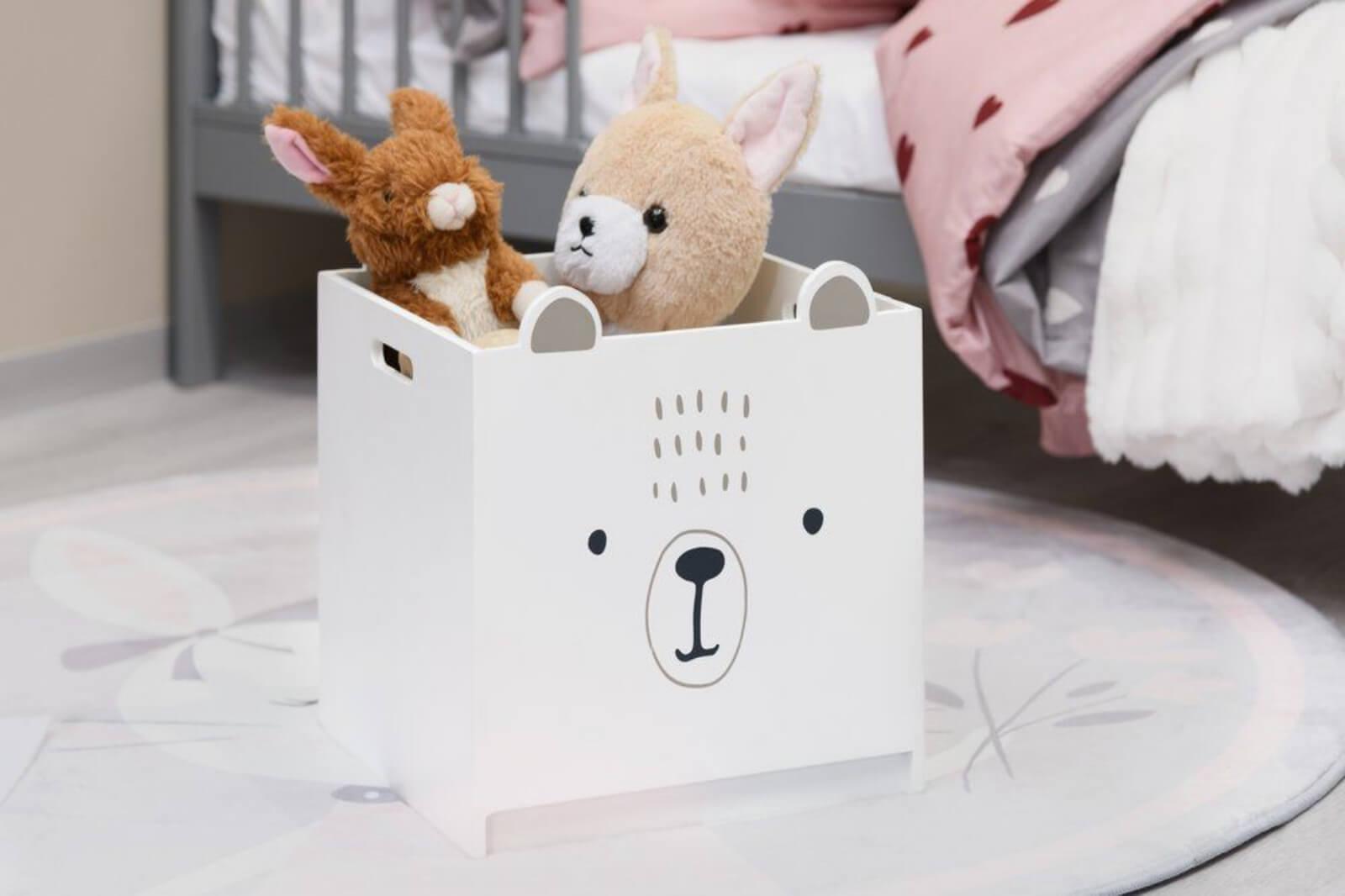 Laatikkoon on hauska kerätä muita lahjoja sisälle! Valkoisessa säilytyslaatikossa nallekuviointi on laatikon molemmilla puolilla.