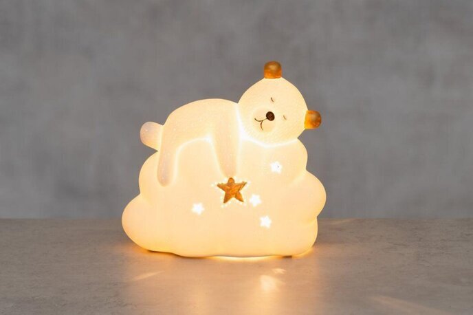 Suloinen pilvien päällä nukkuva nallekarhu sopii mainiosti vaikka yövaloksi lipaston päälle. Valaisin on posliinia.