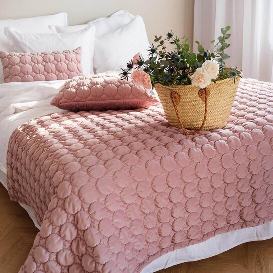 Esimerkiksi vaalean roosan sävyinen muhkea päiväpeitto tuo makuuhuoneeseen ylellisen romanttisen ilmeen.