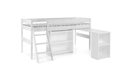 Matala Nukkumatti-puoliparvisänky sopii erinomaisesti pieneen huoneeseen. Työtason, avohyllyn ja tikkaat voidaan asentaa joustavasti joko oikealle tai vasemmalle puolelle.