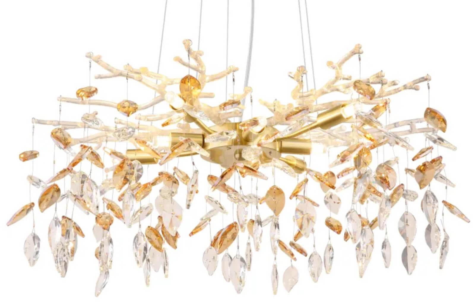 Danna kattokruunun avulla saa tuotua huoneeseen glamouria tunnelmaa ja näyttävyyttä. Valaisin on halkaisijaltaan 61 cm, joten riippuvalaisin sopii suureenkin tilaan, kuten ruokailutilaan tai olohuoneeseen. Valaisimen kullan värisestä rungosta erottuu kauniisti kirkkaan värisiä oksia, joista riippuu eri korkeudella kirkkaita ja meripihkan värisiä kristallilasisia lehtiä, mikä tekee kattokruunusta todella koristeellisen ja elegantin. Danna kattokruunu on upea sisustuselementti myös valon ollessa sammutettuna. Valaisimeen sopii kahdeksan G9 kantaista polttimoa, jotka tulee hankkia erikseen. Tuo ylellistä ilmettä ja luksusta kotiisi kauniilla Globon Danna kattokruunulla! Toimitamme valaisimen nopeasti ja edullisesti!