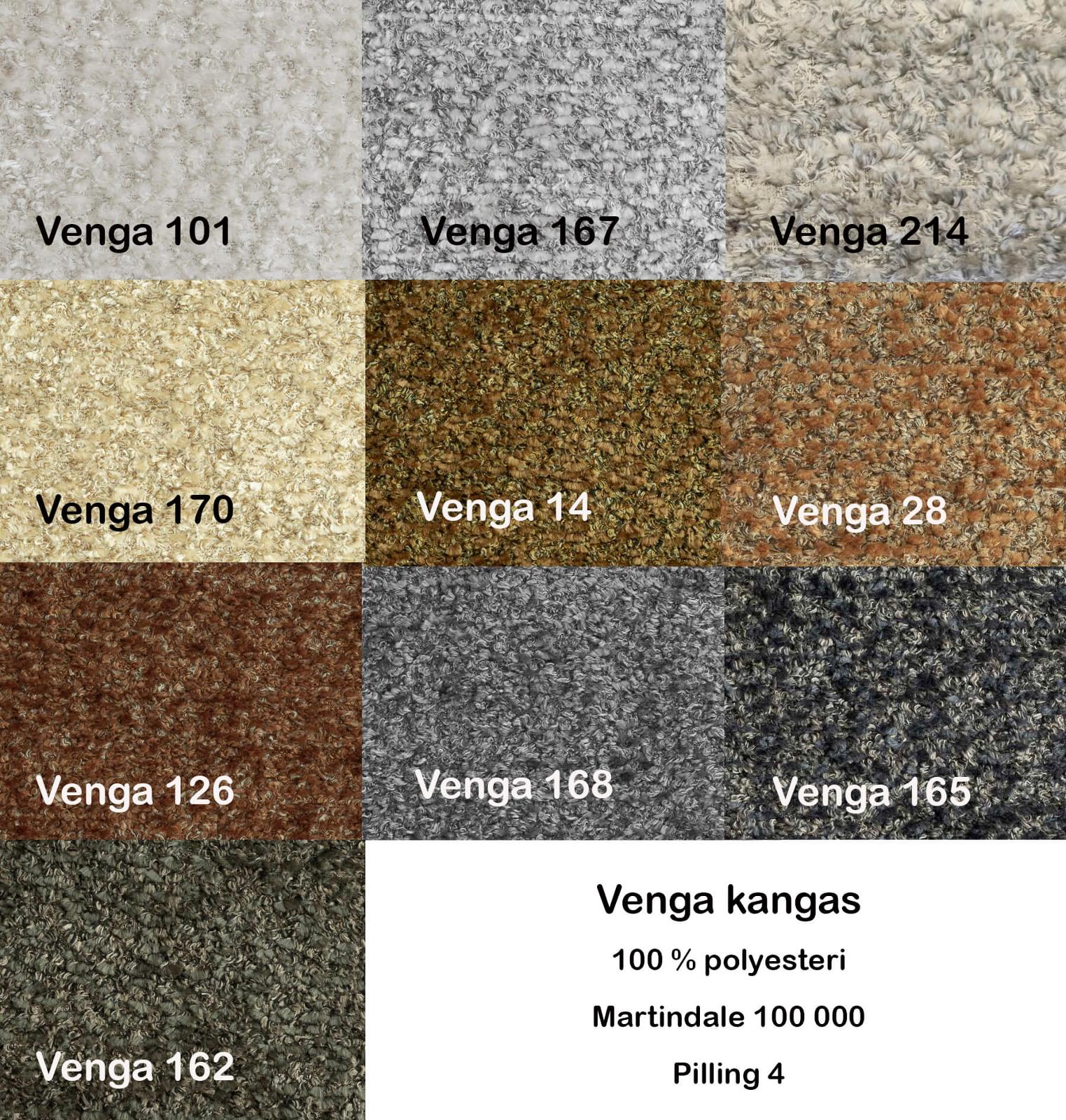 - Venga: Polyester 100 %, kulutuksenkesto 100 000, Pilling-arvo 4, vesipestävä