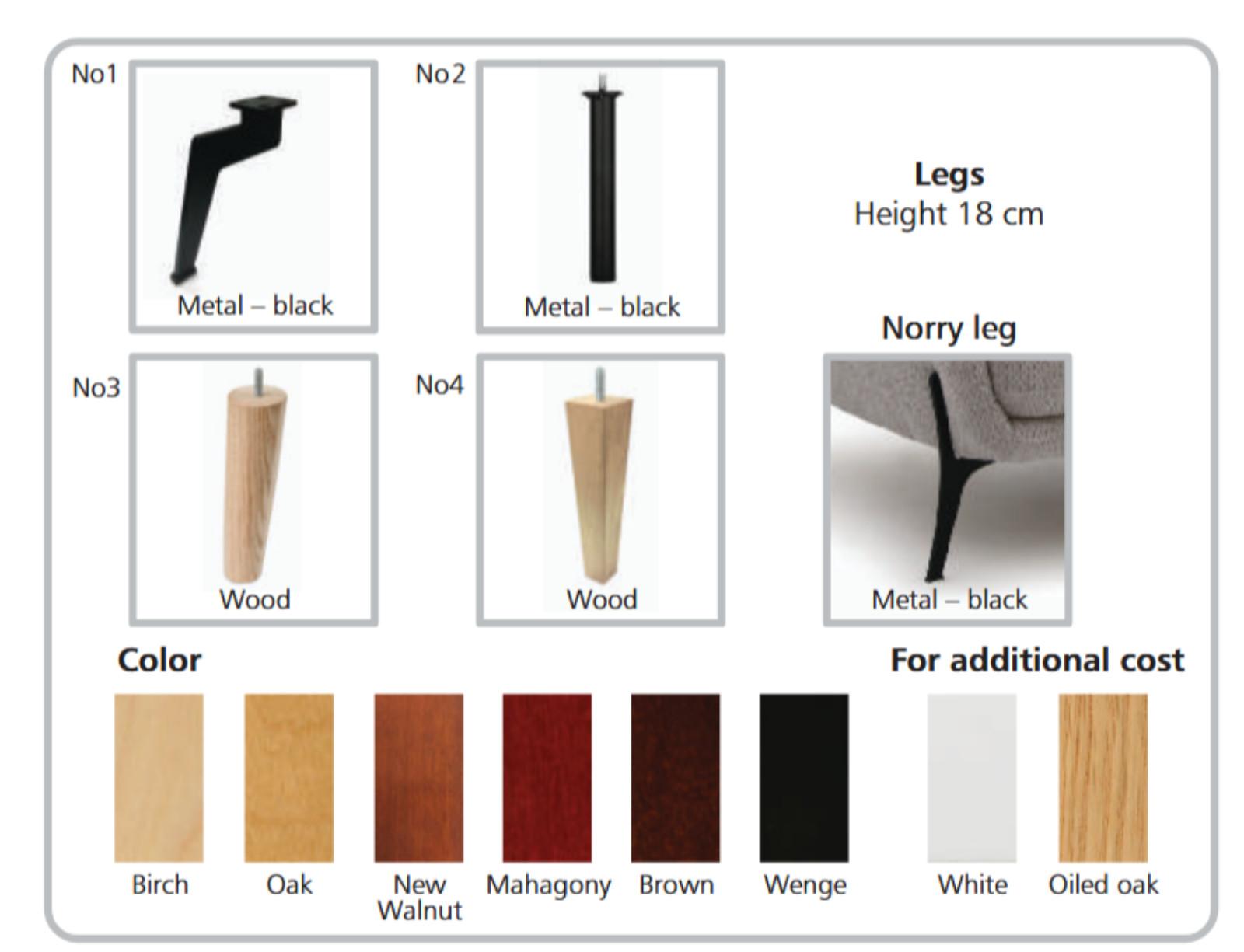 - Kirjoita kommenttikenttään, mikäli haluat jalat erilaisina kuin kuvien sohvissa olevat mustat metallijalat No1.
