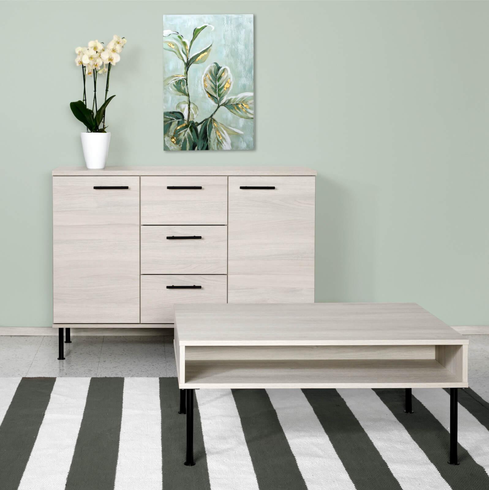 Kotimaisen Joki sohvapöydän kannen väriksi saa valittua joko valkoisen, hopeajalavan tai pähkinän. Puun syyt erottuvat kauniisti hopeajalavan ja pähkinän sävyisissä kansissa, tuoden pintaan elävyyttä. Mustat korkeat metallijalat tekevät sohvapöydästä kauniin ilmavan ja modernin. Sohvan kannen päällä on mukavasti laskutilaa ja kannen alapuolella on avolokerikko, johon saa siististi sijoitettua esimerkiksi lehtiä, kaukosäätimiä tai muita tavaroita. Joki sohvapöydän kansi on valmistettu kestävästä kalustelevystä, joten se kestää käytössä pitkään. Joki tuotesarjasta löytyy useita muitakin kalusteita, joista voi luoda toimivan ja näyttävän kokonaisuuden olohuoneeseen. Tilaa laadukas Joki sohvapöytä nro 15 nyt edulliseen hintaan verkkokaupastamme! Toimitamme sen halutessasi vaikka kotiinkuljetettuna ulko-ovellesi!
