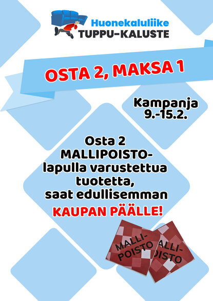 Kampanja voimassa myymälässä 9.-15.2. Ei koske sänkyjä. Myymälän mallisänkyjä juuri nyt -50% tarjoushinnoista!