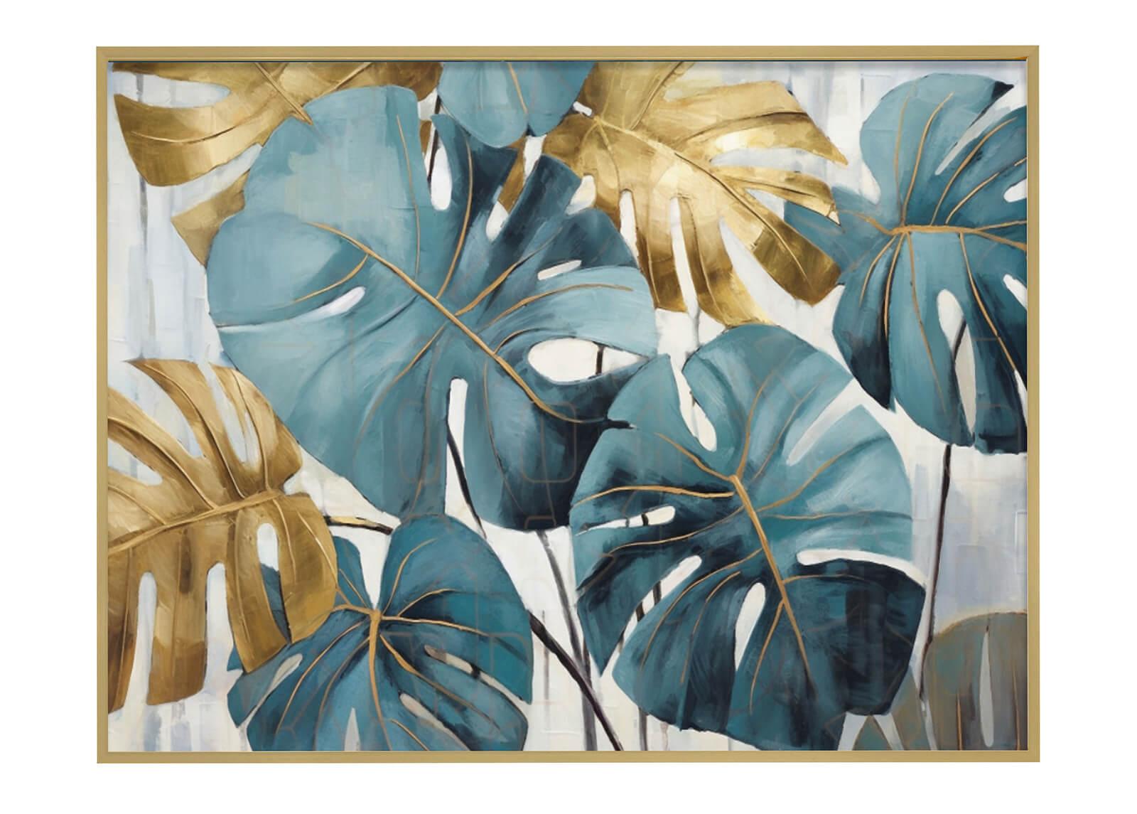 Monstera taulussa on kuvattu sinisiä ja kultaisia lehtiä luoden niistä kauniin kokonaisuuden. Taulu toimii upeana katseenvangitsijana esimerkiksi makuuhuoneessa, mutta sopii myös vaikka olohuoneeseen, keittiöön tai eteiseen. Sisustustaulun väritys on värikäs, mutta silti neutraali, joten sopii moderniin kuin klassiseen sisustukseen. Taulua kehystää kultaiset kehykset, jotka sointuvat kauniisti taulun kanssa yhteen. Kuva on peitetty lasilla, mikä suojaa kuvaa pölyltä. Sisustustaulun leveys on 70 cm ja korkeus 50 cm, joten taululla saa helposti näyttävyyttä seinälle. Ihastuttava Monstera taulu on ostettavissa edulliseen hintaan Kauhajoen myymälästämme.