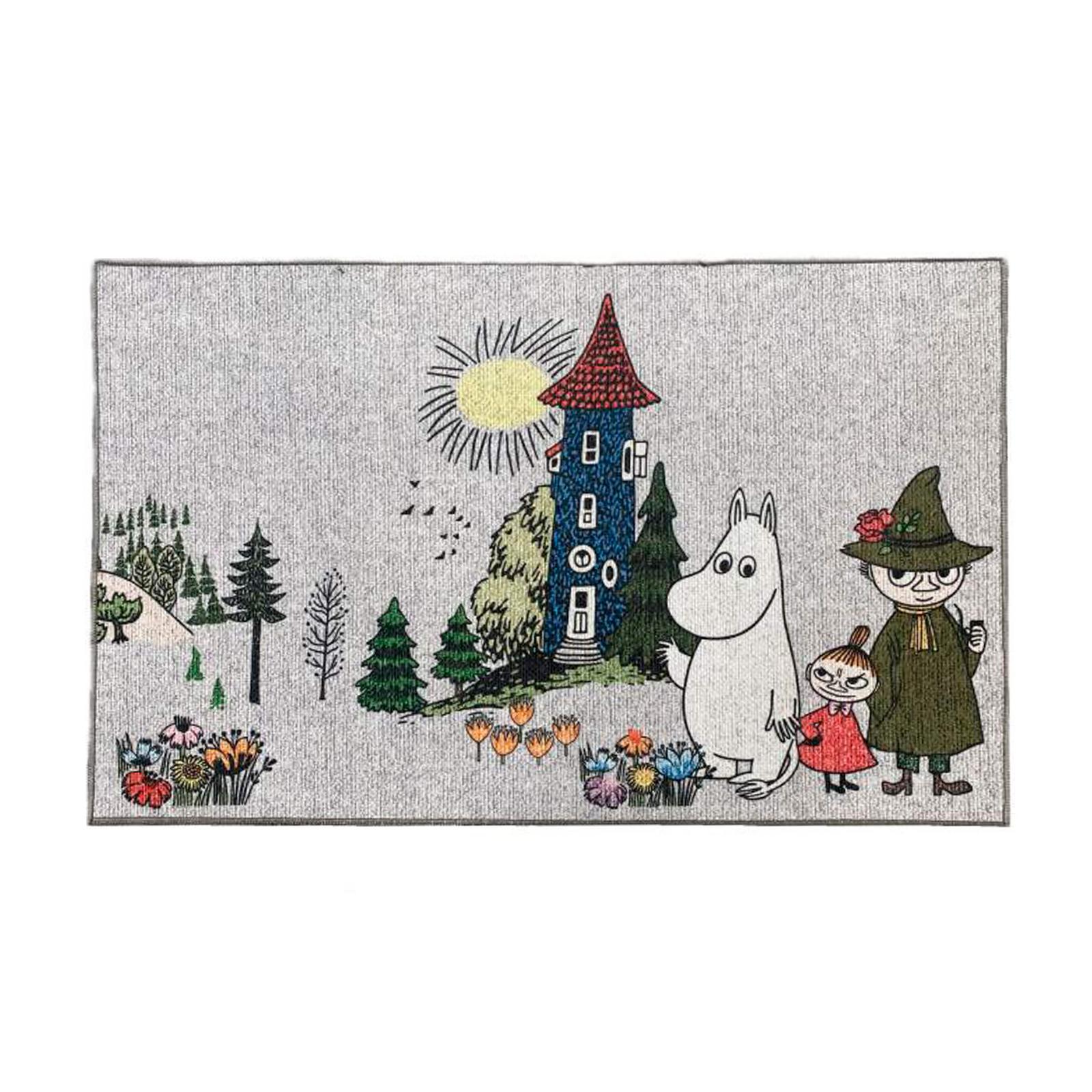 Muumilaakso kynnysmatto toivottaa vieraat tervetulleeksi iloisella ja värikkäällä kuosilla. Muumipeikko, Nuuskamuikkunen ja Pikku Myy, jotka viettävät Muumitalon edustalla aurinkoista kesäpäivää. Taustaväriltään harmaa matto on helposti yhdistettävissä monenlaiseen sisustukseen. Kynnysmaton liukumattoman pohjan ansiosta matto pysyy turvallisesti paikoillaan ja sopii myös vilkkaasti kuljettaviin tiloihin. Kaiken lisäksi sileäpintainen matto on mukavan tuntuinen jalkojen alla sekä helppo pitää puhtaana tuuletuksen ja imuroinnin avulla. Tämä suorakulmainen Muumilaakso kynnysmatto 50x80 cm sopii ilahduttamaan niin eteisen, pienen tilan, lastenhuoneen kuin mökin ilmettä!