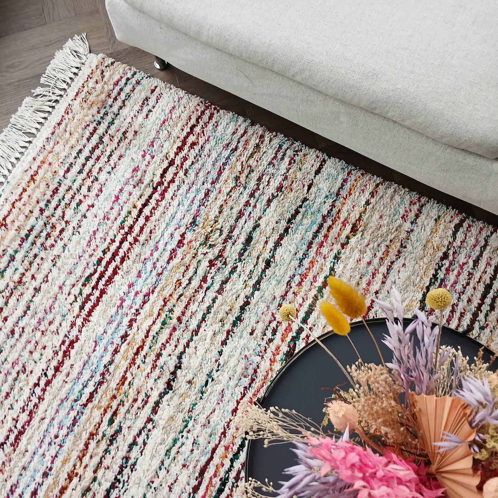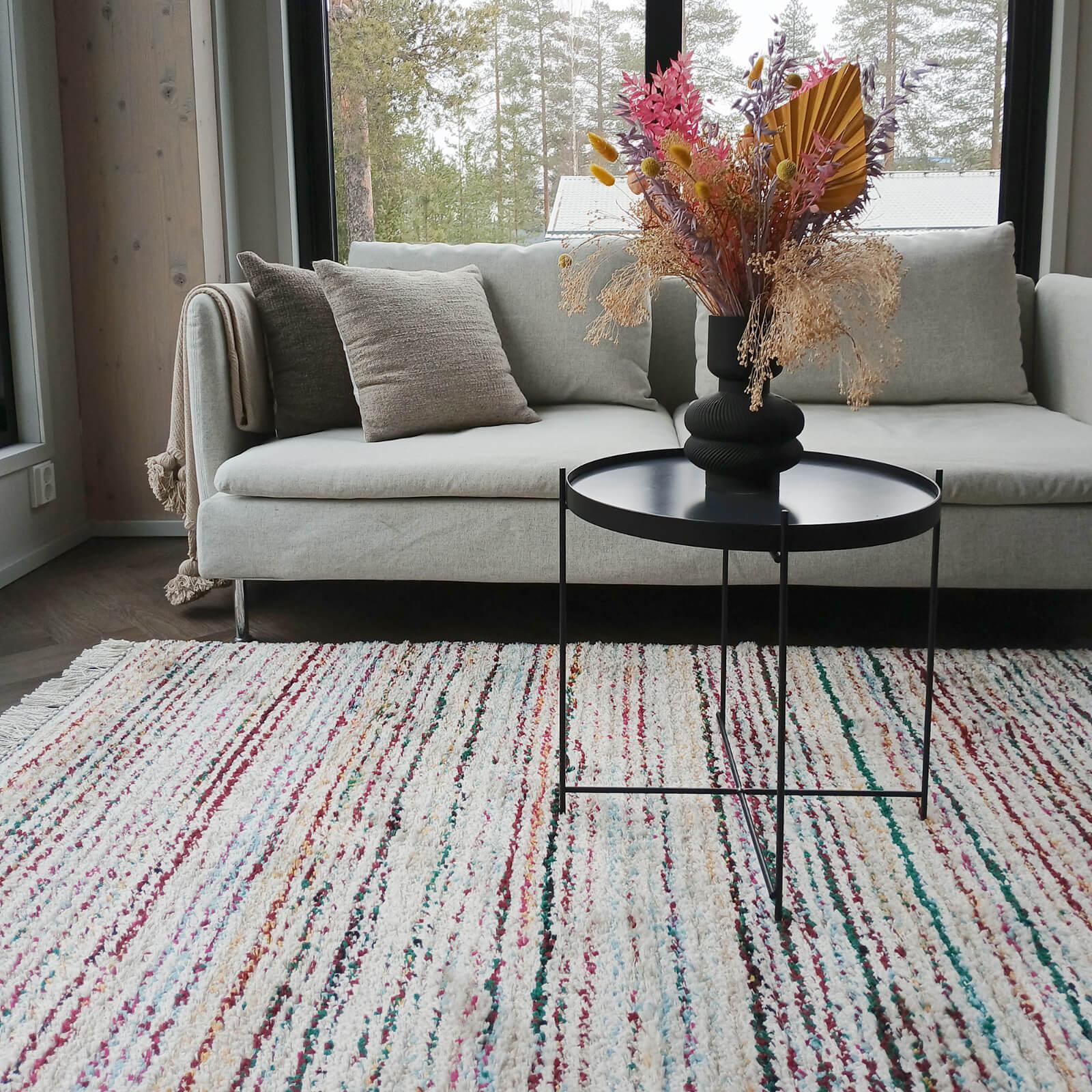 Narvik nukkamassa on iloisen värikäs raidoitus, josta erottuvat keltaisen, punaisen, sinisen, vihreän ja turkoosin sävyt. Valkoinen pohjaväri antaa matolle raikkaan ilmeen. Hauskana yksityiskohtana toimivat hapsut maton päissä. Näiden ominaisuuksien ansiosta matto on helppo yhdistää niin perinteiseen, moderniin kuin retroon tyyliin. Narvik matossa on myös todella pehmeä nukkapinta, joka tuntuu mukavan lämpöiseltä jalkojen alla. Nukkamatto sopii hienosti esimerkiksi olohuoneeseen sohvaryhmän eteen tai makuuhuoneeseen piristystä ja mukavuutta tuomaan. Tilaa muhkea Narvik nukkamatto nyt edullisesti verkkokaupastamme ja toimitamme maton sinulle nopeasti!