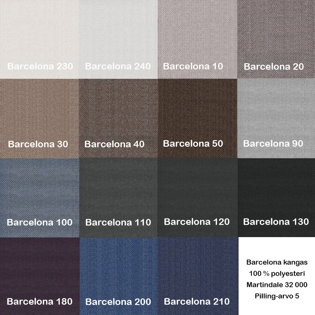 Barcelona-kangas: polyesteri 100 %, kulutuksenkesto 100 000, Pilling-arvo 5