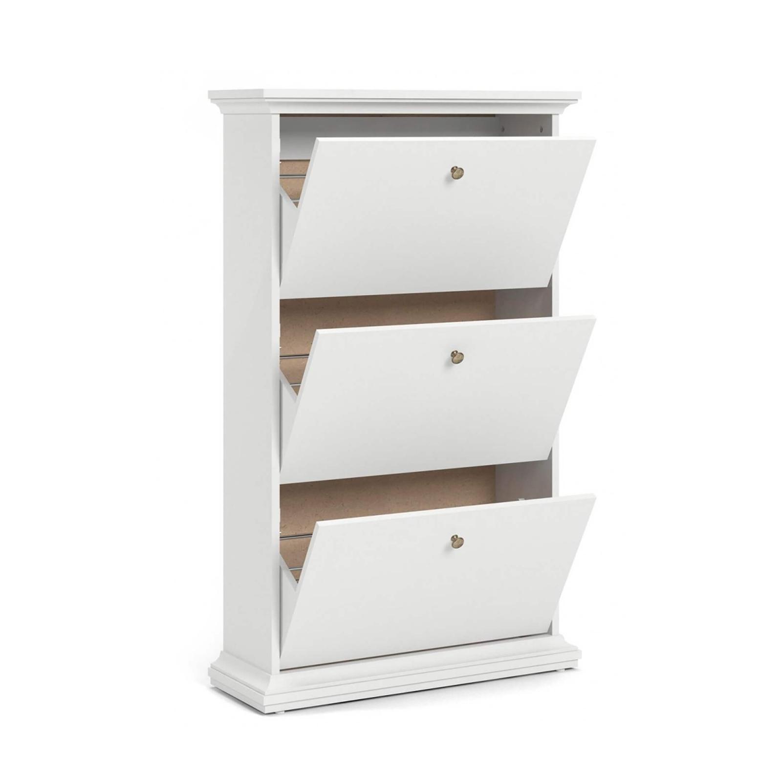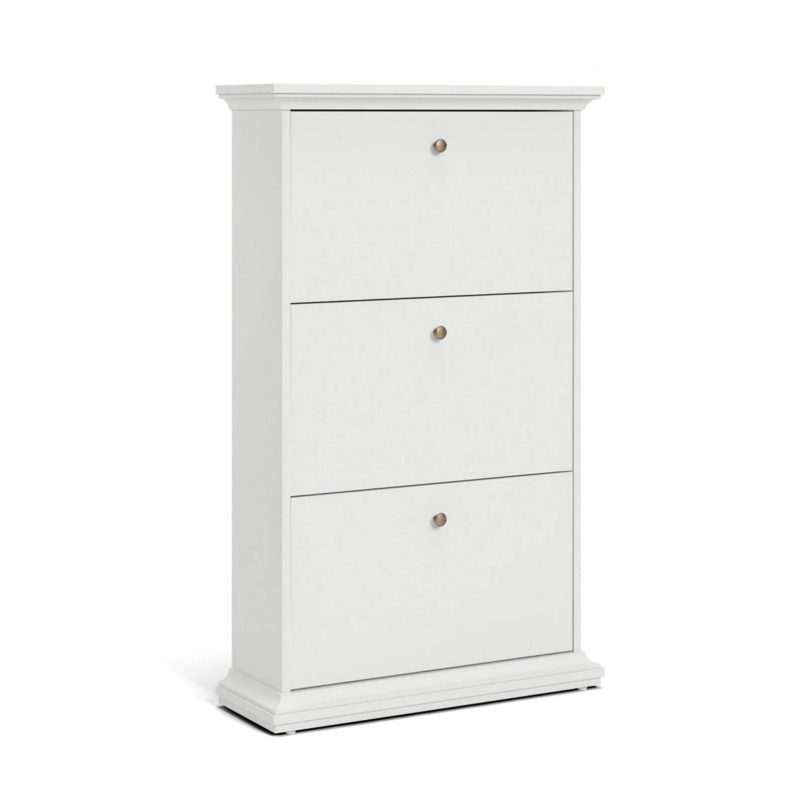 Paris kenkäkaapissa on kolme käännettävää laatikkoa, joihin saa kengät kätevästi säilytykseen ja tehden samalla eteisestä tai pukeutumistilasta siistin ja tyylikkään. Valkoinen kenkäkaappi on leveydeltään 78 cm ja syvyydeltään 28 cm, joten kenkäkaappi sopii pieneenkin tilaan. Kannen päällä on lisäksi laskutilaa kodin tavaroille. Kenkäkaappi on valmistettu kestävästä kalustelevystä ja viimeistelty tyylikkäillä messingin värisillä nuppivetimillä sekä näyttävällä sokkelilla, mitkä korostavat kaapin maalaisromanttista ja klassista ilmettä. Tilaa kaunis Paris kenkäkaappi valkoinen edulliseen hintaan ja nopealla toimituksella verkkokaupastamme tai tule ostamaan myymälästämme!