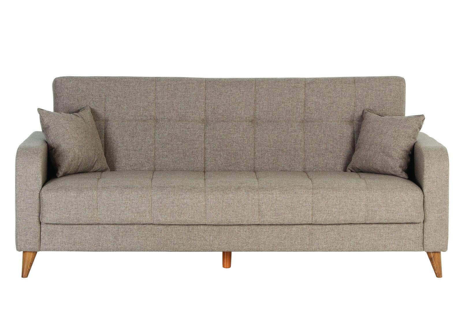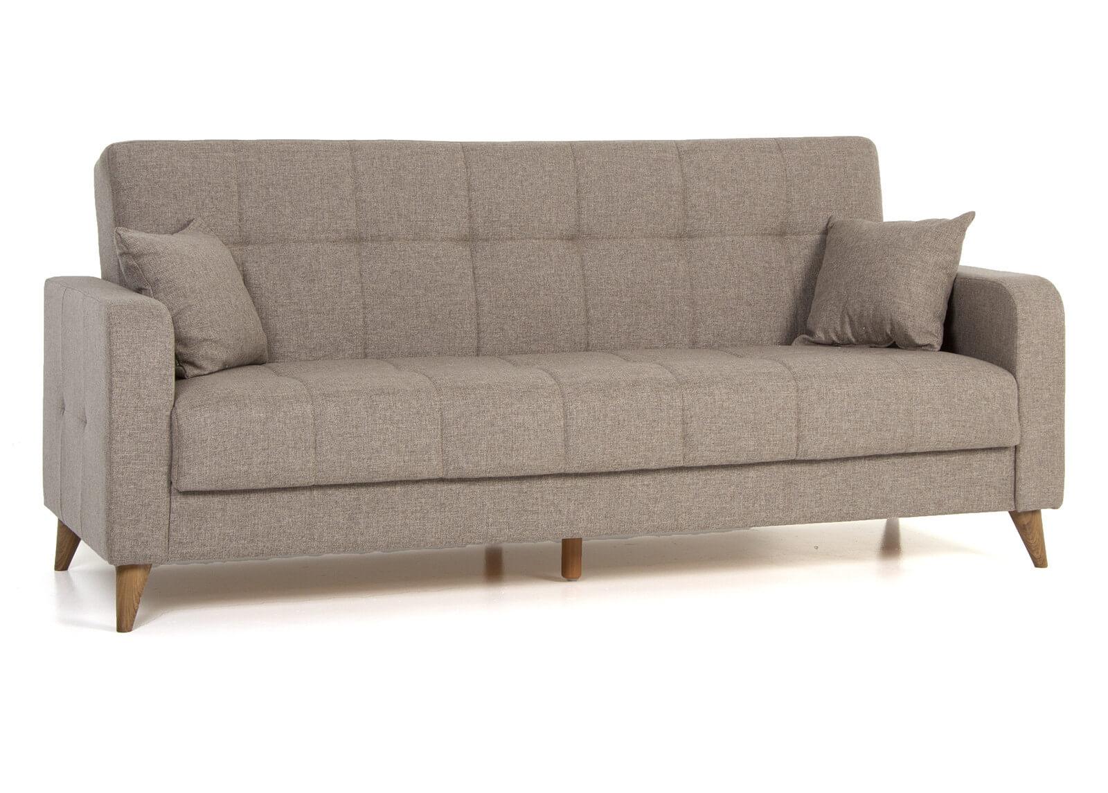 Pinja vuodesohva on käytännöllinen valinta niin olohuoneeseen, vierashuoneeseen kuin opiskelija-asuntoon. Pinja vuodesohva on verhoiltu ruskealla kankaalla, jota täydentävät selkänojan ja istuinosan näyttävät ruututikkaukset. Muotoilultaan sohva on kauniin ajaton, ja helppo yhdistää esimerkiksi retroon, moderniin tai klassiseen sisustukseen. Lisää näyttävyyttä ja ilmavuutta sohvaan tuovat puunväriset korkeat muovijalat, joiden ansiosta myös siivoaminen sohvan alta käy vaivattomasti. Sohvalla on erittäin mukava istua joustavan istuinosan ja tukevien käsinojien sekä korkean selkänojan ansiosta. Kaiken lisäksi 3-istuttava sohva muuntuu helposti vuoteeksi helppokäyttöisen click-clack vuodemekanismin avulla. Sohvan alaosaa nostamalla ylöspäin kuuluu naksahdus, jonka jälkeen istuinosa lasketaan takaisin alas ja vuode on valmis. Lisää pehmeyttä ja mukavuutta saat hankkimalla 122x195 cm kokoisen vuoteen päälle petauspatjan, joka samalla suojaa myös verhoilua. Istuimen alla on kaksi laatikkoa, johon saa kätevästi esimerkiksi vuodevaatteet säilytykseen, kun ne eivät ole käytössä. Sohvan mukana tulee kaksi samanlaisella vaaleanharmaalla kankaalla verhoiltua koristetyynyä. Tilaa tyylikäs Pinja vuodesohva edulliseen hintaan ja nopealla toimituksella verkkokaupastamme!