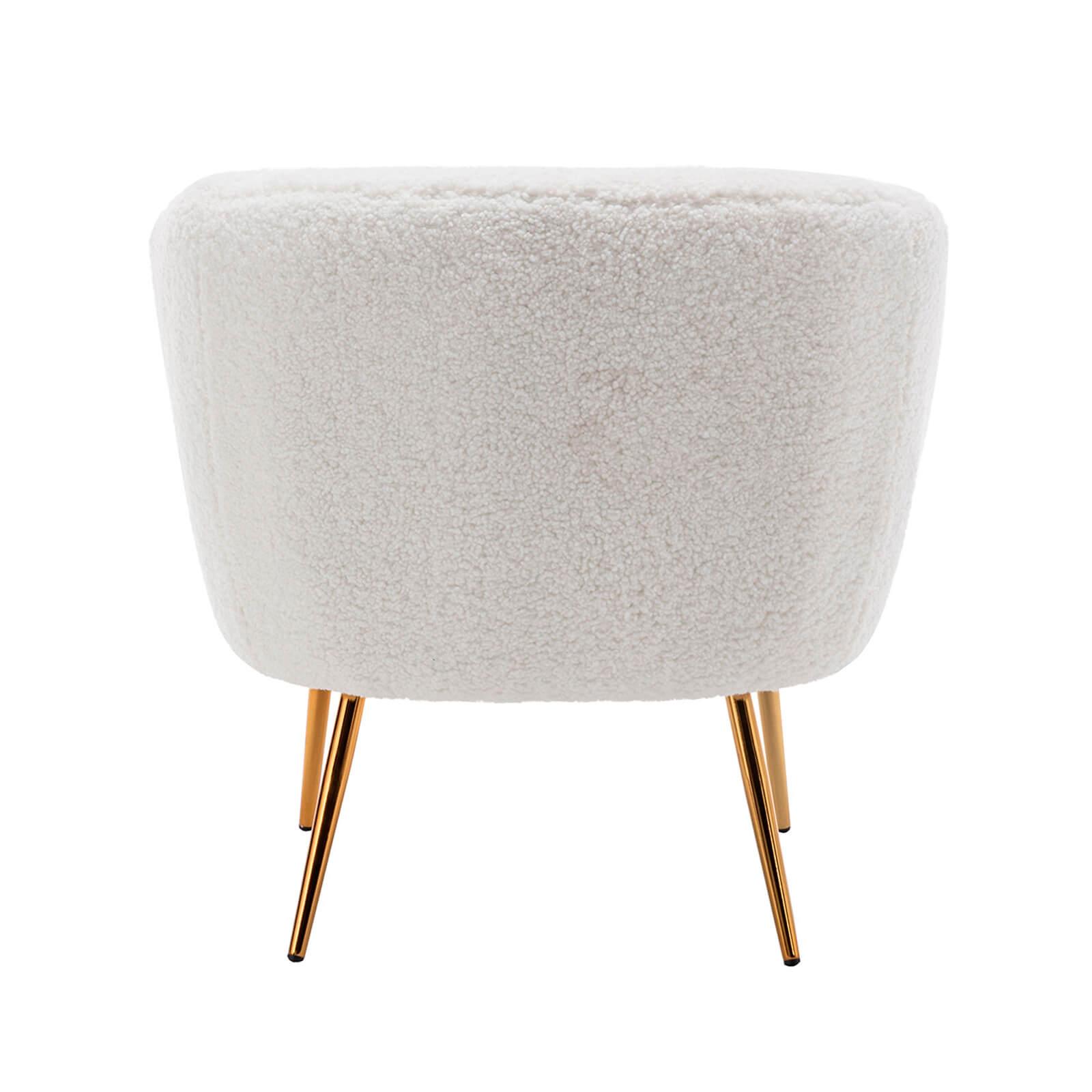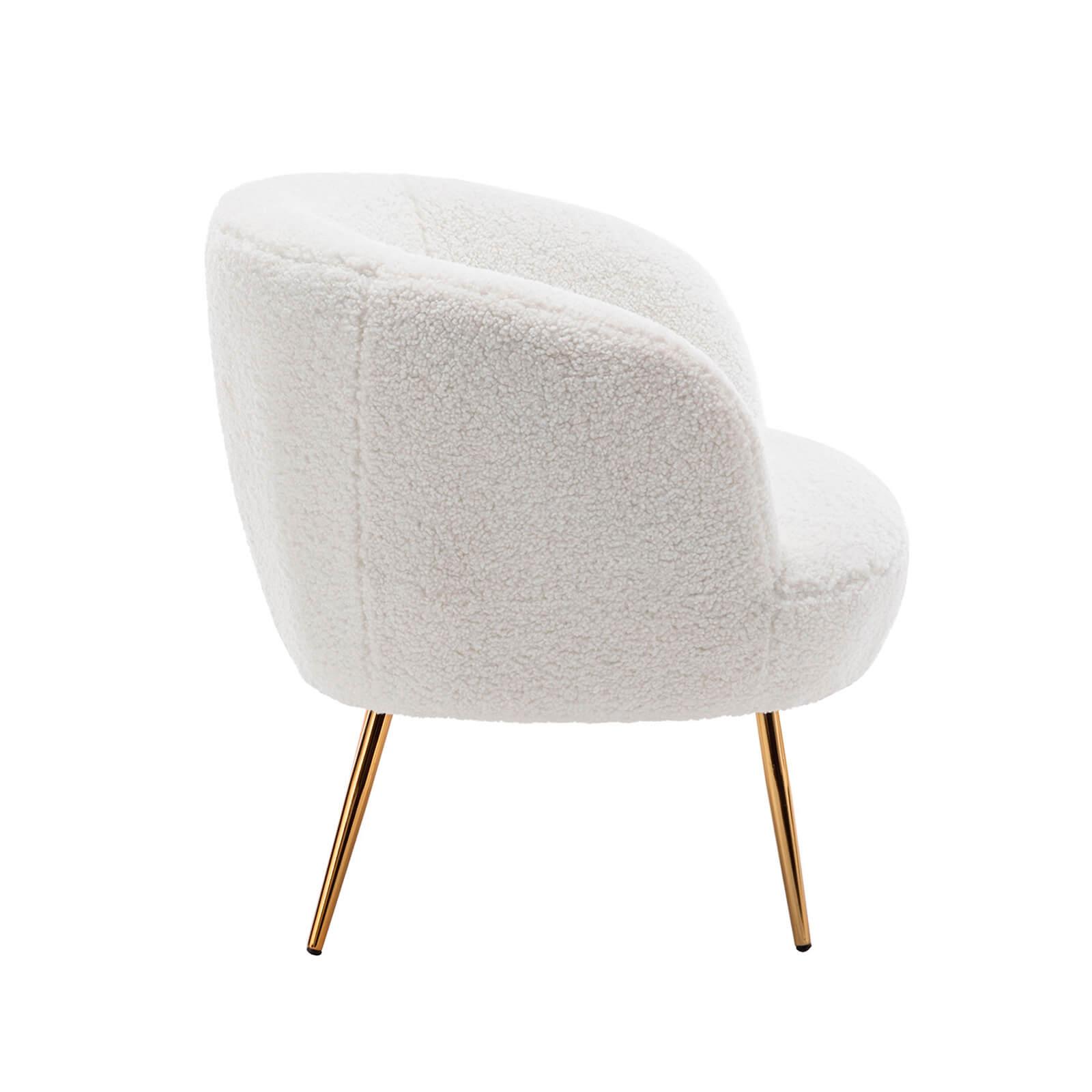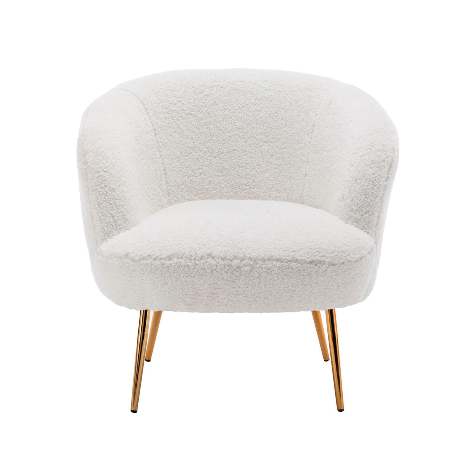 Teddy nojatuoli hurmaa valkoisella pörröisellä Teddy kangasverhoilulla, joka muistuttaa pehmeää lampaankarvajäljitelmää. Pehmeä kangasverhoilu tekee tuolista ylellisen ja lämpimän rentoutumispaikan. Pyöristetty muotoilu tuo trendikkyyttä ja modernia ilmettä. Elegantit kullan väriset metallijalat viimeistelevät upean kokonaisuuden. Lepotuoli tuo glamouria tyyliä ja ylellisyyttä niin olohuoneeseen, makuuhuoneeseen kuin lukunurkkaukseen. Tuolilla on helppo istua tukevasti selkänojan ja käsinojien yhdistelmän sekä napakan istuinmukavuuden ansiosta. Tilaa Teddy nojatuoli valkoinen edullisesti ja nopealla toimituksella verkkokaupastamme!