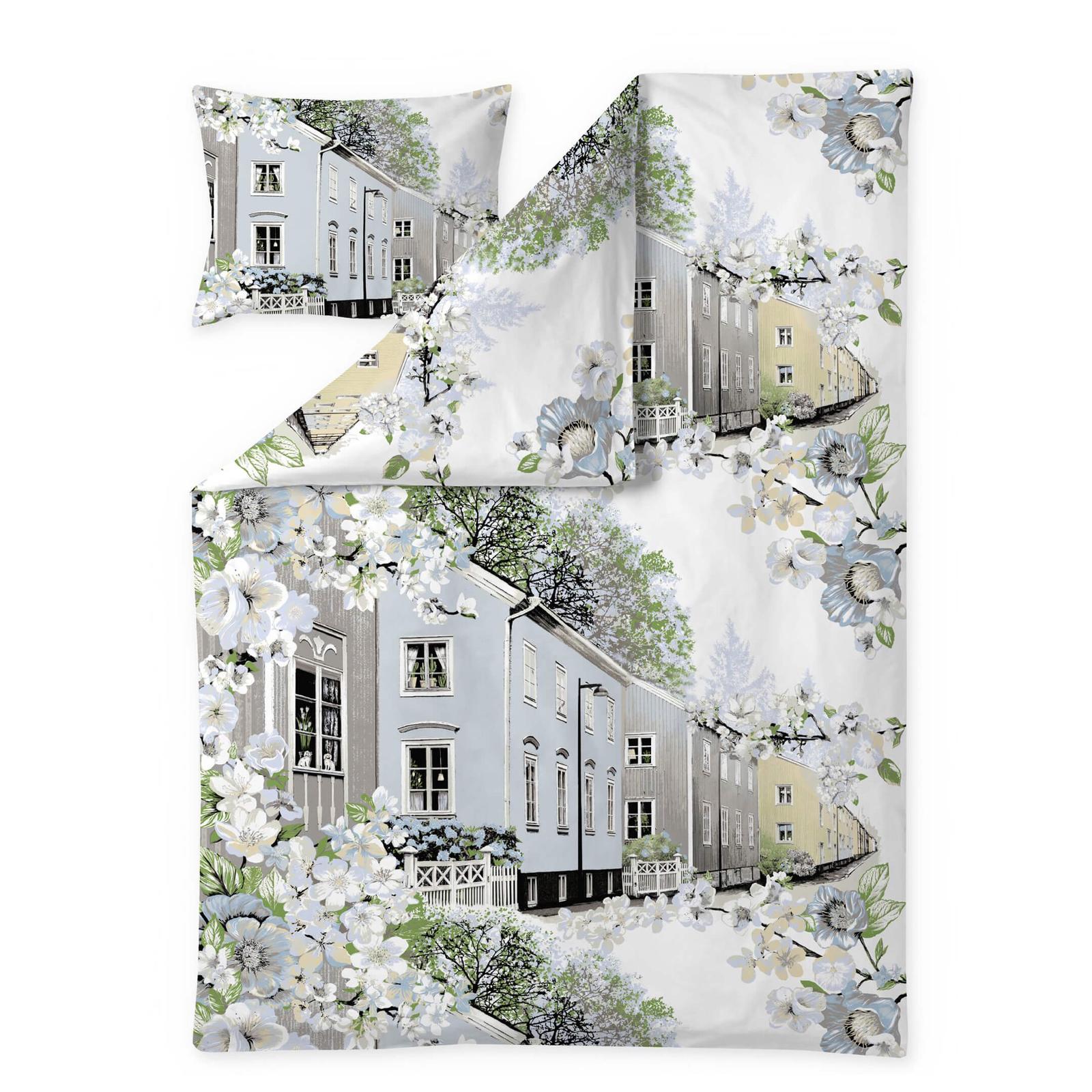 Matleena Issakaisen suunnittelema idyllinen Kotikulmat kuosi sijoittuu Helsingin Kumpulaan. Kuosista erottuu vaaleansinisiä, harmaita sekä keltaisia puutaloja, ja taustaa koristavat kauniit omenapuun oksat ja kukat. Näihin värikkäisiin ja romanttisiin Vallilan pussilakanoihin on mukava kietoutua ja nukahtaa. Vallilan Kotikulmat pussilakanasetti on valmistettu 100 % puuvillasta, joten lakanat ovat myös mukavan pehmeän tuntuiset ja hengittävät. Uudista makuuhuoneen ilmettä monivärisellä Vallilan Kotikulmat pussilakanasetillä, ja tilaa se nyt edulliseen hintaan ja nopealla toimituksella verkkokaupastamme!