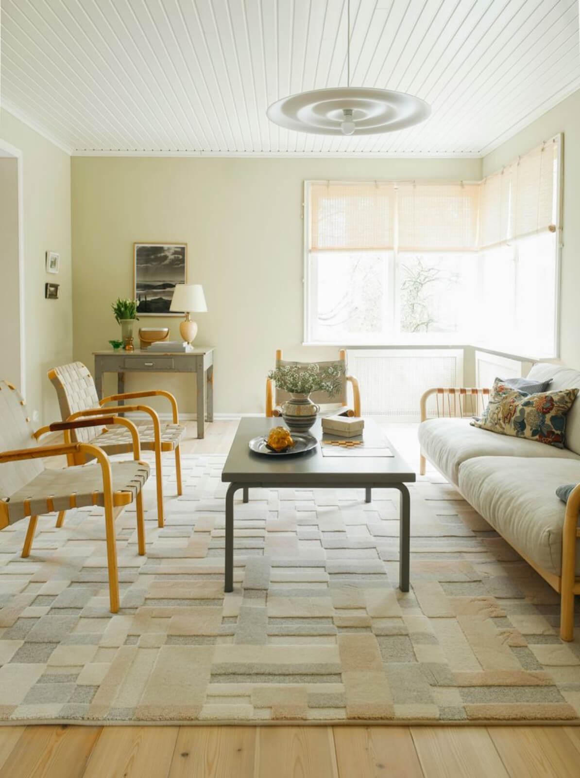 Domino villamatto beigen sävyssä tuo pehmeää lämpöä ja hillittyä rytmiä
